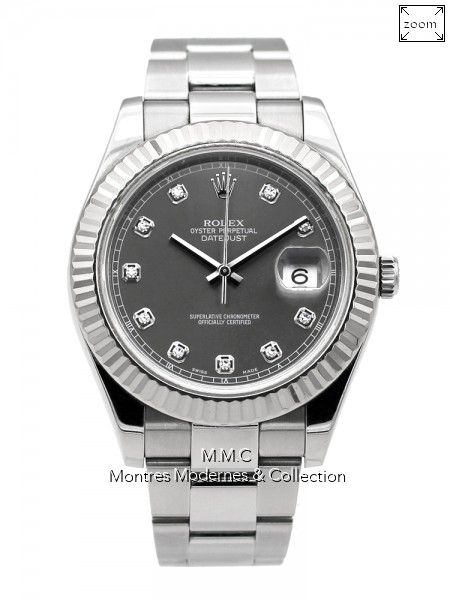 41mm in steel, bezel in white gold , gray dialwith diamonds index, sapphire glass, screwed backcase, screwed crown, water resistant to 100m |