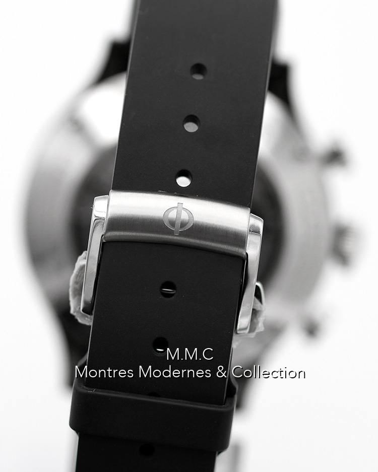44mm in steel, black dialwith luminescent arabic numbers, sapphire glass, screwed backcase transparent, water resistant to 50m