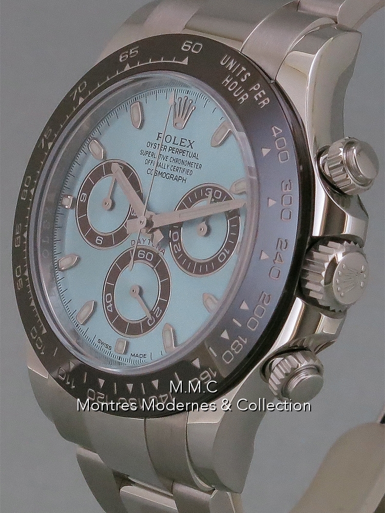 40mm in platinum, bezel fixed in ceramic , blue dialwith sticks index, sapphire glass, screwed backcase, screwed crown, screwed push, water resistant to 100m