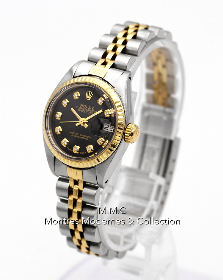 26mm in steel, bezel in yellow gold, black dialwith diamonds index, sapphire glass, screwed backcase, screwed crown, water resistant