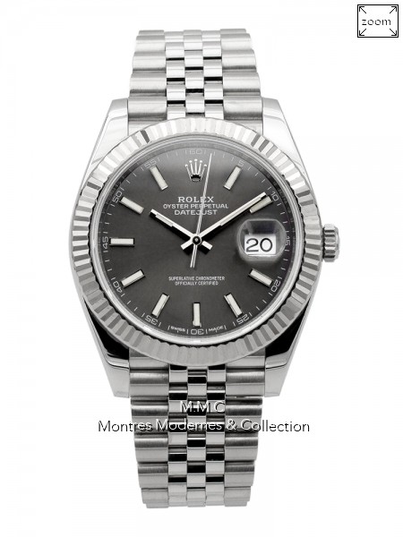 41mm in steel, bezel in white gold , gray dialwith sticks index, sapphire glass, screwed backcase, screwed crown, water resistant to 100m |